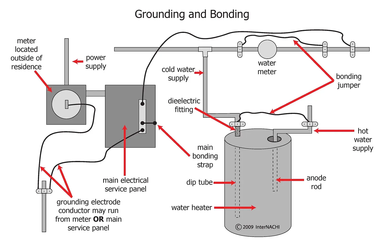 Electrical grounding is the intentional connection of the home’s electrical system to the earth. This is accomplished through a grounding electrode system, which may include: